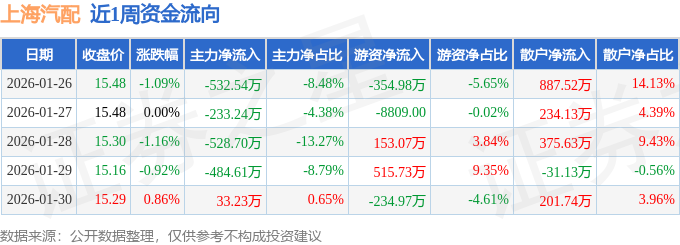 资金流向数据方面,本周上海汽配主力资金合计净流出1745.86万元,游资资金合计净流入77.97万元,散户资金合计净流入1667.89万元。本周资金流向一览见下表: