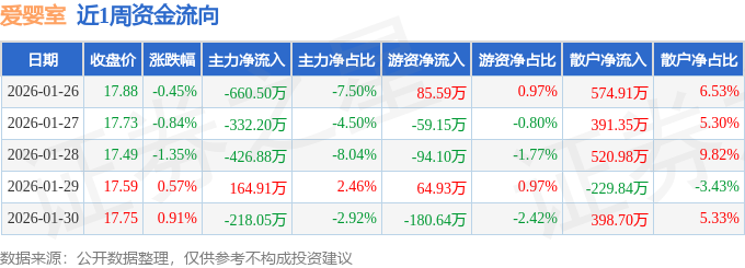 证券之星消息,截至2026年1月30日收盘,爱婴室(603214)报收于17.75元,较上周的17.96元下跌1.17%。本周,爱婴室1月26日盘中最高价报18.02元。1月29日盘中最低价报17.3元。爱婴室当前最新总市值24.59亿元,在专业连锁板块市值排名7/7,在两市A股市值排名4965/5184。