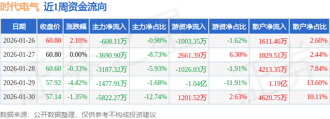 资金流向数据方面,本周时代电气主力资金合计净流出1.48亿元,游资资金合计净流出8615.51万元,散户资金合计净流入2.34亿元。本周资金流向一览见下表: