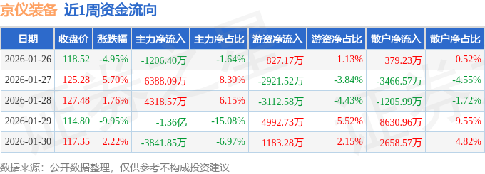 资金流向数据方面,本周京仪装备主力资金合计净流出7965.29万元,游资资金合计净流入969.08万元,散户资金合计净流入6996.21万元。本周资金流向一览见下表: