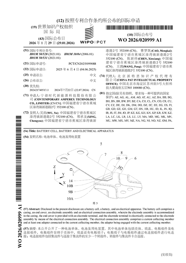 证券之星消息,根据企查查数据显示宁德时代(300750)公布了一项国际专利申请,专利名为“电池单体、电池及用电装置”,专利申请号为PCT/CN2025/099088,国际公布日为2026年1月29日。