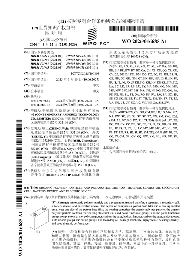 证券之星消息,根据企查查数据显示宁德时代(300750)公布了一项国际专利申请,专利名为“有机聚合物颗粒及其制备方法、隔离膜、二次电池单体、电池装置和用电装置”,专利申请号为PCT/CN2025/100306,国际公布日为2026年1月22日。