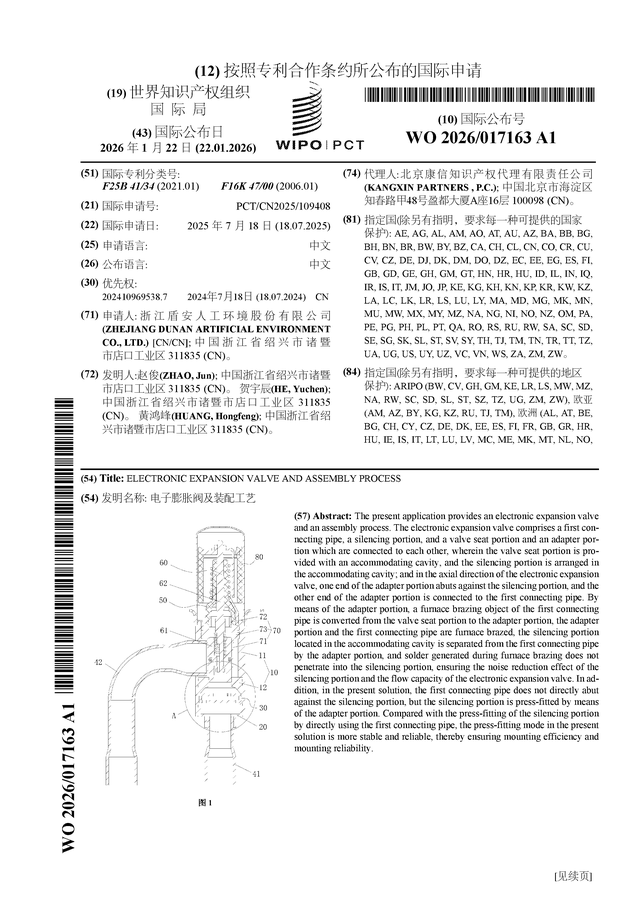 证券之星消息,根据企查查数据显示盾安环境(002011)公布了一项国际专利申请,专利名为“电子膨胀阀及装配工艺”,专利申请号为PCT/CN2025/109408,国际公布日为2026年1月22日。