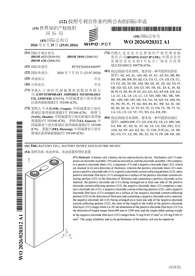 证券之星消息,根据企查查数据显示宁德时代(300750)公布了一项国际专利申请,专利名为“电池单体、电池装置和用电装置”,专利申请号为PCT/CN2024/106997,国际公布日为2026年1月29日。