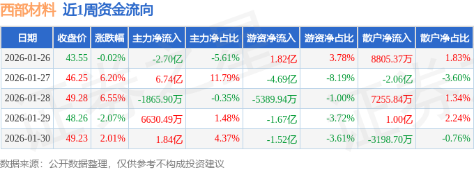 资金流向数据方面,本周西部材料主力资金合计净流入6.36亿元,游资资金合计净流出6.59亿元,散户资金合计净流入2334.05万元。本周资金流向一览见下表: