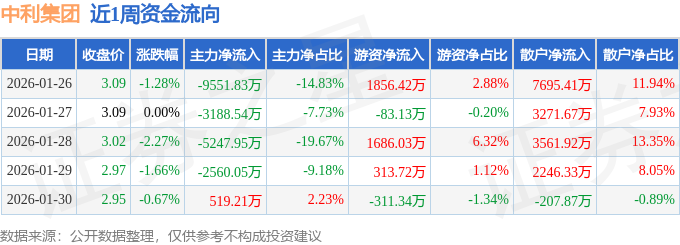 资金流向数据方面,本周中利集团主力资金合计净流出2.0亿元,游资资金合计净流入3461.71万元,散户资金合计净流入1.66亿元。本周资金流向一览见下表: