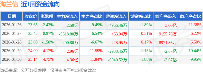 资金流向数据方面,本周海兰信主力资金合计净流入2.94亿元,游资资金合计净流出1.42亿元,散户资金合计净流出1.53亿元。本周资金流向一览见下表: