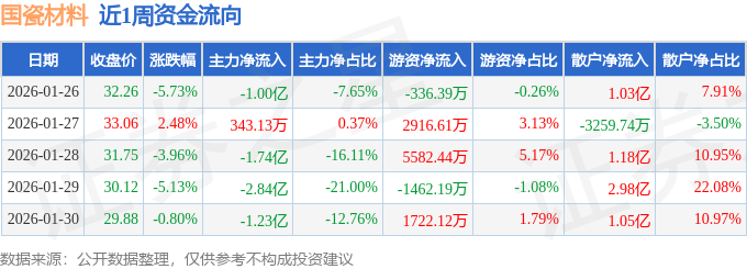 资金流向数据方面,本周国瓷材料主力资金合计净流出6.77亿元,游资资金合计净流入8422.59万元,散户资金合计净流入5.93亿元。本周资金流向一览见下表: