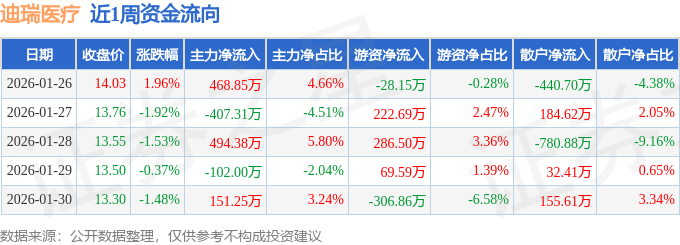 证券之星消息,截至2026年1月30日收盘,迪瑞医疗(300396)报收于13.3元,较上周的13.76元下跌3.34%。本周,迪瑞医疗1月26日盘中最高价报14.12元。1月30日盘中最低价报13.19元。迪瑞医疗当前最新总市值36.27亿元,在医疗器械板块市值排名101/127,在两市A股市值排名4302/5184。