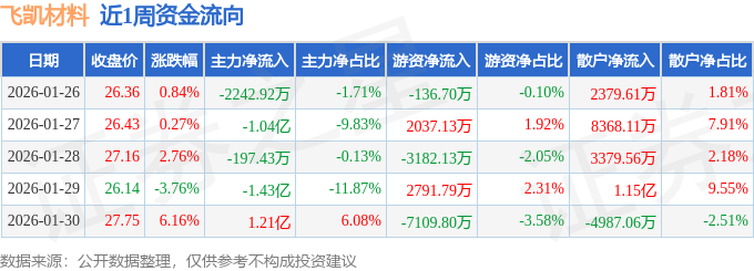 资金流向数据方面,本周飞凯材料主力资金合计净流出1.51亿元,游资资金合计净流出5599.71万元,散户资金合计净流入2.07亿元。本周资金流向一览见下表: