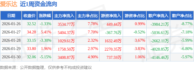 资金流向数据方面,本周爱乐达主力资金合计净流入1.51亿元,游资资金合计净流入4722.11万元,散户资金合计净流出1.99亿元。本周资金流向一览见下表: