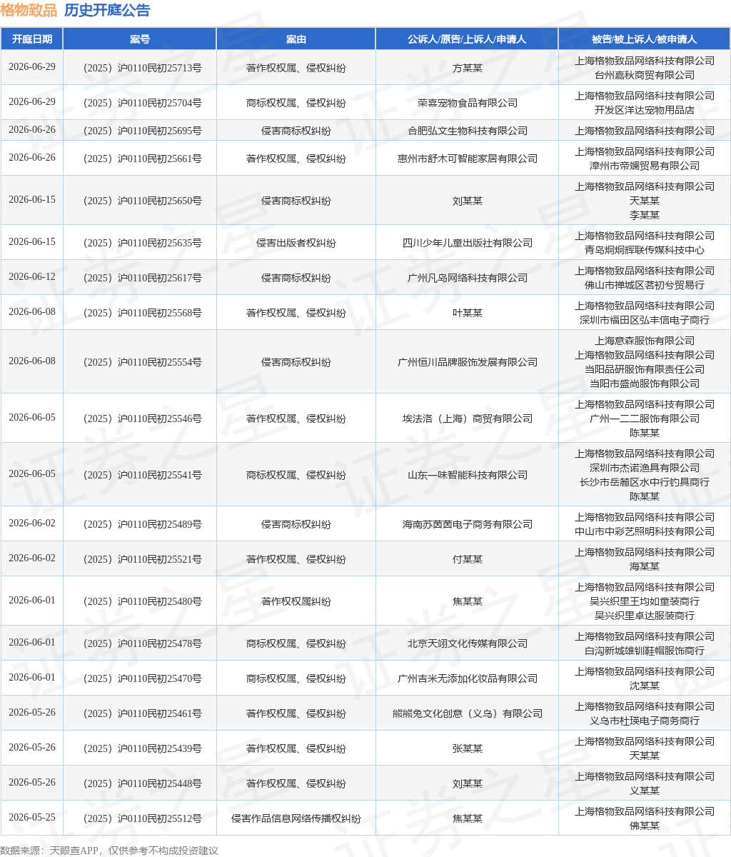 案号:(2025)沪0110民初25687号根据统计,近一年内以上海格物致品网络科技有限公司为当事人的历史开庭公告有3948则,其中案由为“侵害外观设计专利权纠纷”的公告以881则居首,其次为“侵害商标权纠纷”有801则,“著作权权属、侵权纠纷”有655则。历史开庭公告(前20条)如下: