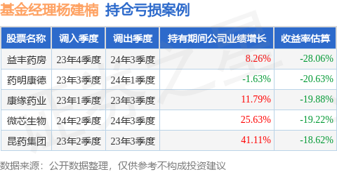 杨建楠管理的上银医疗健康混合A基金在23年4季度买入益丰药房,在持有3个季度后在24年3季度卖出。持有期间的估算收益率为-28.06%,持有期间益丰药房在2023年到2024年的年报归属净利润增幅达8.26%。