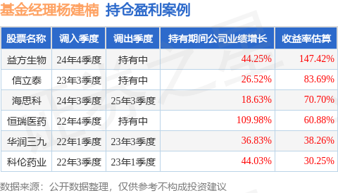 杨建楠管理的上银医疗健康混合A基金在24年4季度买入益方生物,已连续持有1年又1个季度。持有期间的估算收益率为147.42%,持有期间益方生物在2024年到2025年的中报归属净利润增幅达44.25%。
