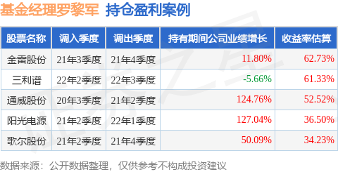 罗黎军管理的华润元大双鑫债券A基金在21年3季度买入金雷股份,在持有1个季度后在21年4季度卖出。持有期间的估算收益率为62.73%,持有期间金雷股份在2020年到2021年的年报营业总收入增幅达11.8%。