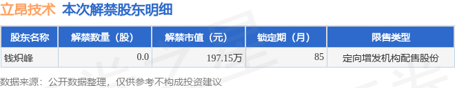 证券之星消息,根据市场公开信息整理,立昂技术(300603)于2月2日将有19.29万股限售股份解禁,为公司定向增发机构配售股份,占公司总股本0.04%。(本次数据根据历史公告整理得出,实际情况以上市公司最新公告为准)最近一年内,该股累计解禁83.46万股,占总股本的0.18%。本次解禁后,公司还有9086.7万股限售股份,占总股本19.55%。具体如下图所示: