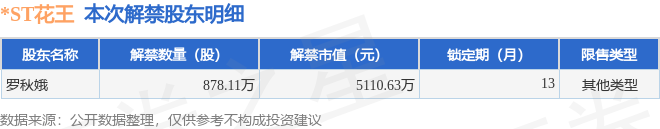 证券之星消息,根据市场公开信息整理,*ST花王(603007)于2月2日将有878.11万股限售股份解禁,为公司其他类型,占公司总股本0.99%。(本次数据根据历史公告整理得出,实际情况以上市公司最新公告为准)最近一年内,该股累计解禁1.86亿股,占总股本的21.08%。本次解禁后,公司还有1.9亿股限售股份,占总股本21.43%。具体如下图所示: