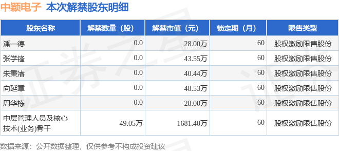 证券之星消息,根据市场公开信息整理,中颖电子(300327)于2月2日将有49.05万股限售股份解禁,为公司股权激励限售股份,占公司总股本0.14%。(本次数据根据历史公告整理得出,实际情况以上市公司最新公告为准)最近一年内,该股累计解禁107.08万股,占总股本的0.31%。本次解禁后,公司还有246.59万股限售股份,占总股本0.72%。具体如下图所示: