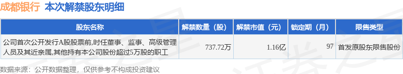 证券之星消息,根据市场公开信息整理,成都银行(601838)于2月2日将有737.72万股限售股份解禁,为公司首发原股东限售股份,占公司总股本0.17%。(本次数据根据历史公告整理得出,实际情况以上市公司最新公告为准)本次解禁后,公司已无限售股份。具体如下图所示: