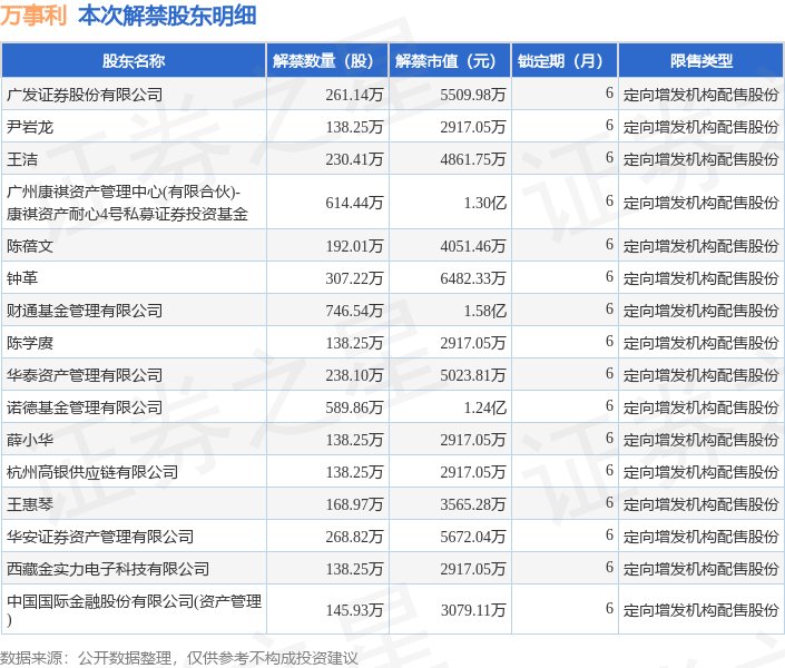 证券之星消息,根据市场公开信息整理,万事利(301066)于2月2日将有4454.69万股限售股份解禁,为公司定向增发机构配售股份,占公司总股本18.96%。(本次数据根据历史公告整理得出,实际情况以上市公司最新公告为准)本次解禁后,公司还有180.64万股限售股份,占总股本0.77%。具体如下图所示: