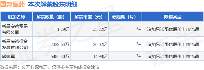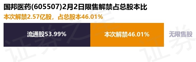 证券之星消息,根据市场公开信息整理,国邦医药(605507)于2月2日将有2.57亿股限售股份解禁,为公司追加承诺限售股份上市流通,占公司总股本46.01%。(本次数据根据历史公告整理得出,实际情况以上市公司最新公告为准)本次解禁后,公司已无限售股份。具体如下图所示: