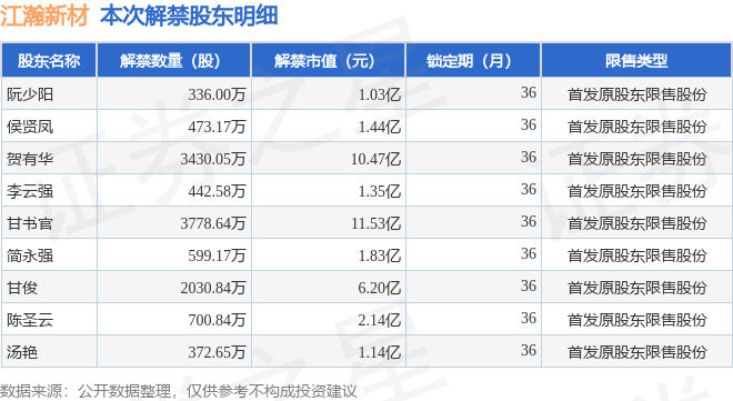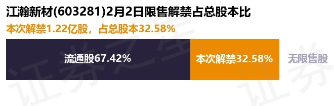 证券之星消息,根据市场公开信息整理,江瀚新材(603281)于2月2日将有1.22亿股限售股份解禁,为公司首发原股东限售股份,占公司总股本32.58%。(本次数据根据历史公告整理得出,实际情况以上市公司最新公告为准)本次解禁后,公司已无限售股份。具体如下图所示: