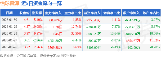 1月30日的资金流向数据方面,主力资金净流入3883.09万元,占总成交额1.85%,游资资金净流入2959.4万元,占总成交额1.41%,散户资金净流出6842.49万元,占总成交额3.27%。
