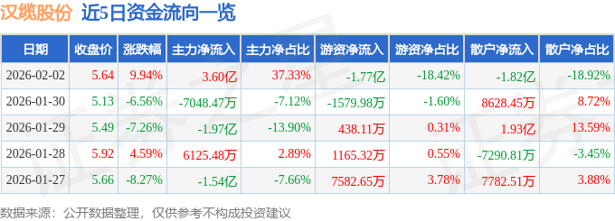 证券之星消息,汉缆股份2月2日涨停收盘,收盘价5.64元。该股于9点45分涨停,未打开涨停,截止收盘封单资金为1.55亿元,占其流通市值0.83%。