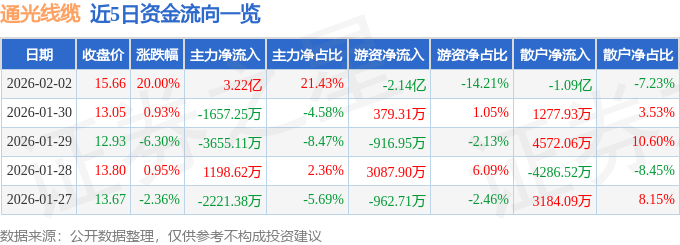 证券之星消息,通光线缆2月2日涨停收盘,收盘价15.66元。该股于14点5分涨停,未打开涨停,截止收盘封单资金为1.15亿元,占其流通市值1.57%。