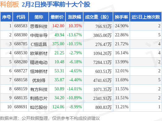 当日科创板换手率前10大个股中1只个股收涨,平均涨幅10.35%,其中思看科技(688583)以换手率24.9%排第一,9只个股近5个交易日中多次上榜。