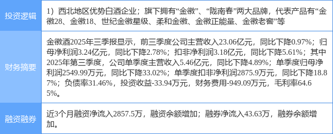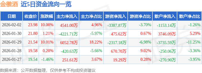 证券之星消息,金徽酒2月2日涨停收盘,收盘价23.98元。该股于14点15分涨停,3次打开涨停,截止收盘封单资金为1905.15万元,占其流通市值0.16%。
