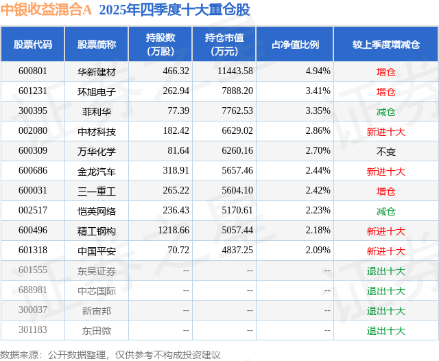 根据2025基金年报公募基金重仓股数据,重仓该股的公募基金共20家,其中持有数量最多的公募基金为中银基金的中银收益混合A。中银收益混合A目前规模为20.73亿元,最新净值1.6988(1月30日),较上一交易日下跌0.56%,近一年上涨40.29%。该公募基金现任基金经理为黄珺。黄珺在任的基金产品包括:中银主题策略混合A,管理时间为2019年3月13日至今,期间收益率为223.65%;中银鑫新消费成长混合A,管理时间为2021年9月6日至今,期间收益率为29.59%;中银卓越成长混合A,管理时间为2023年5月5日至今,期间收益率为30.8%。