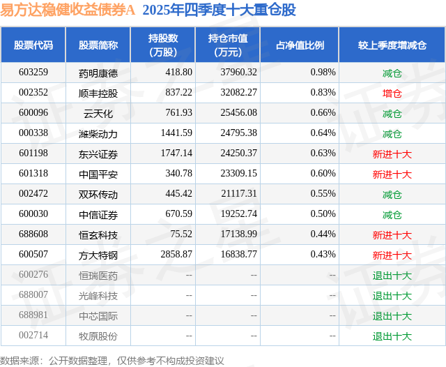 易方达稳健收益债券A的前十大重仓股如下: