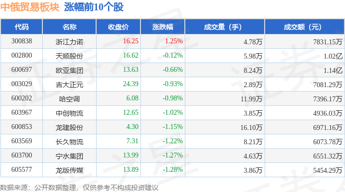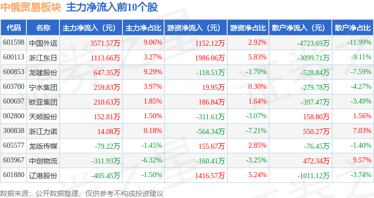从资金流向上来看,当日中俄贸易板块主力资金净流出1.08亿元,游资资金净流出1703.09万元,散户资金净流入1.25亿元。中俄贸易板块个股资金流向见下表:
