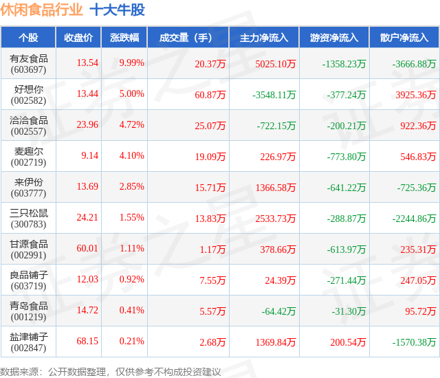 个股表现方面,休闲食品行业当日领涨股为有友食品(603697),该股当日报收13.54,上涨9.99%,成交量20.37万,主力资金净流入5025.1万元。好想你(002582)以上涨5.0%紧随其后,该股当日成交量60.87万,主力资金净流出3548.11万元。除此之外,洽洽食品(002557)、麦趣尔(002719)、来伊份(603777)均进入当日牛股之列。具体个股列表见下表: