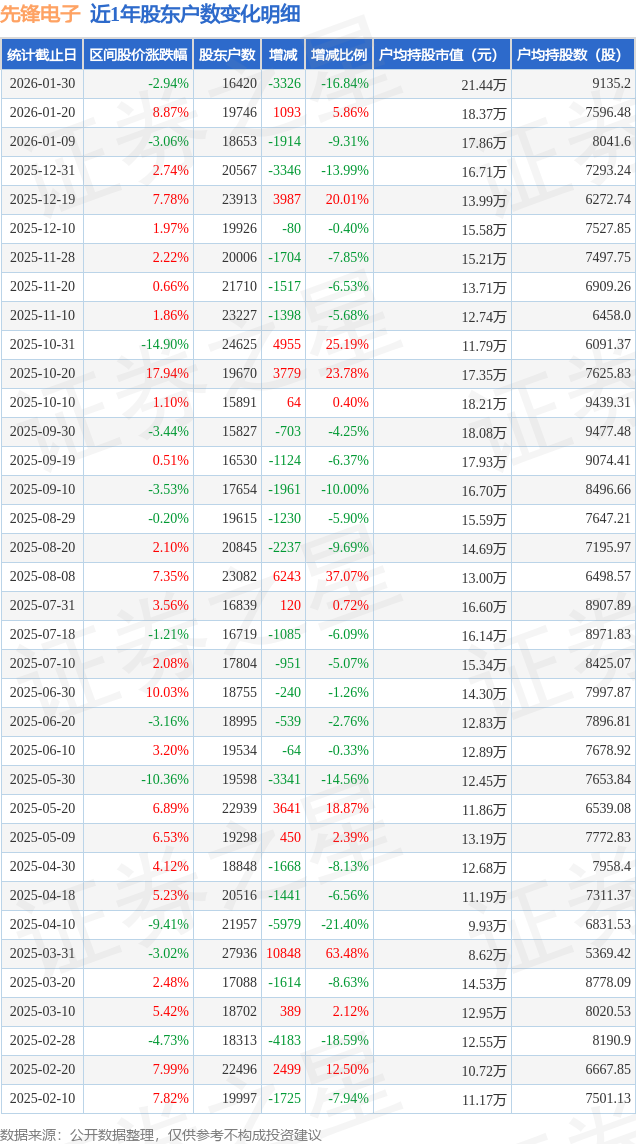 从股价来看,2026年1月20日至2026年1月30日,先锋电子区间跌幅为2.94%,在此期间股东户数减少3326.0户,减幅为16.84%。