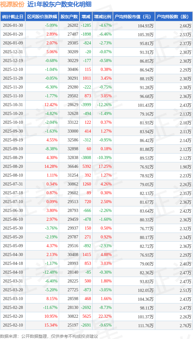从股价来看,2026年1月20日至2026年1月30日,视源股份区间跌幅为5.09%,在此期间股东户数减少1285.0户,减幅为4.67%。