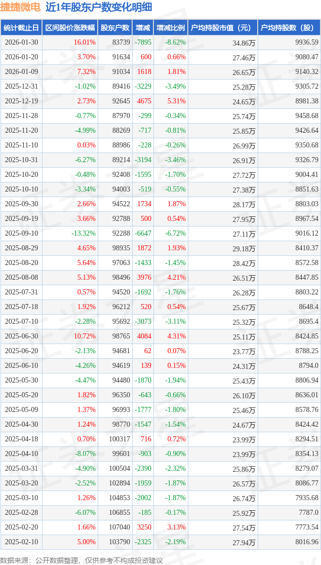 证券之星消息,近日捷捷微电披露,截至2026年1月30日公司股东户数为8.37万户,较1月20日减少7895.0户,减幅为8.62%。户均持股数量由上期的9080.0股增加至9937.0股,户均持股市值为34.86万元。