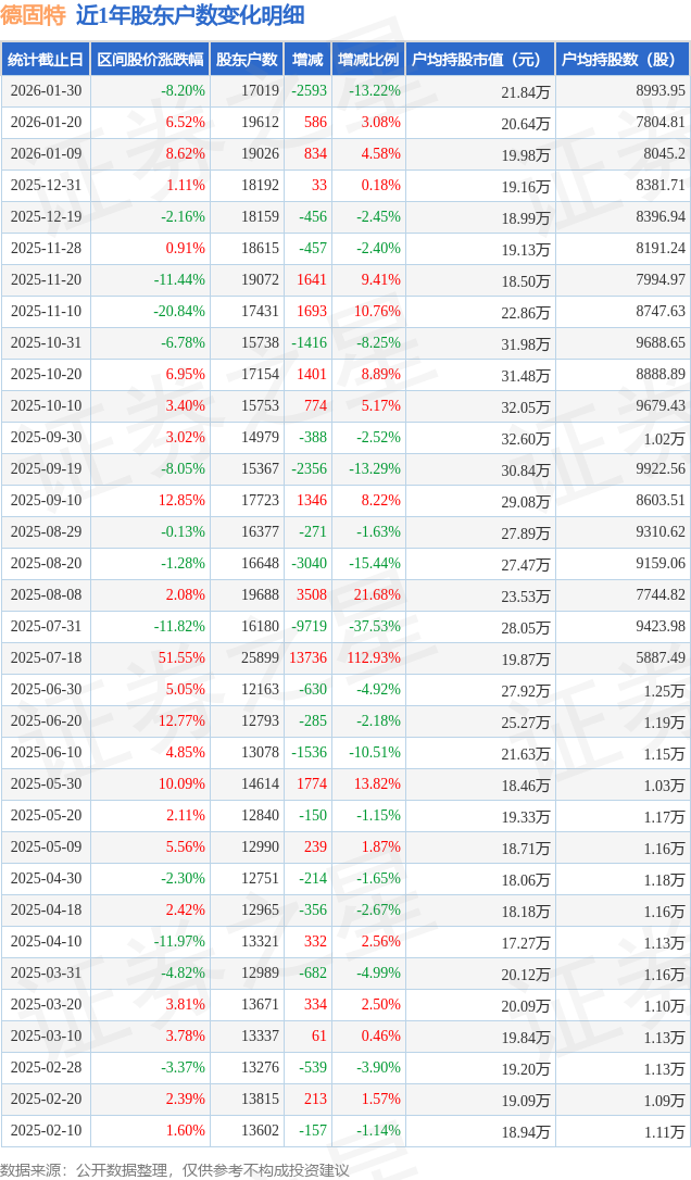 从股价来看,2026年1月20日至2026年1月30日,德固特区间跌幅为8.2%,在此期间股东户数减少2593.0户,减幅为13.22%。