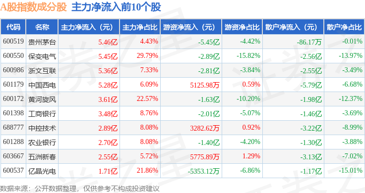资金流向方面,A股指数(000002)成份股当日主力资金净流出合计467.53亿元,游资资金净流入合计179.99亿元,散户资金净流入合计287.53亿元。成份股资金流向详情见下表: