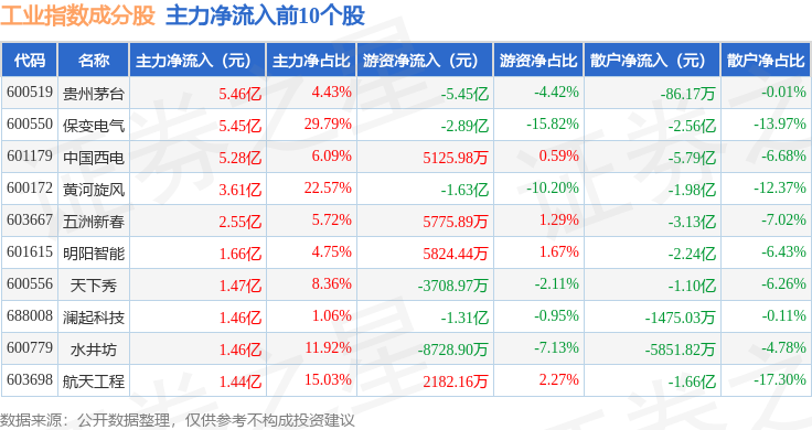 资金流向方面,工业指数(000004)成份股当日主力资金净流出合计402.43亿元,游资资金净流入合计147.22亿元,散户资金净流入合计255.21亿元。成份股资金流向详情见下表: