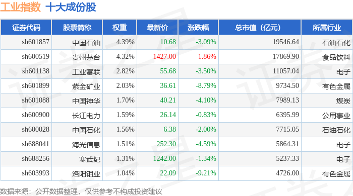 工业指数(000004)十大成份股详情如下: