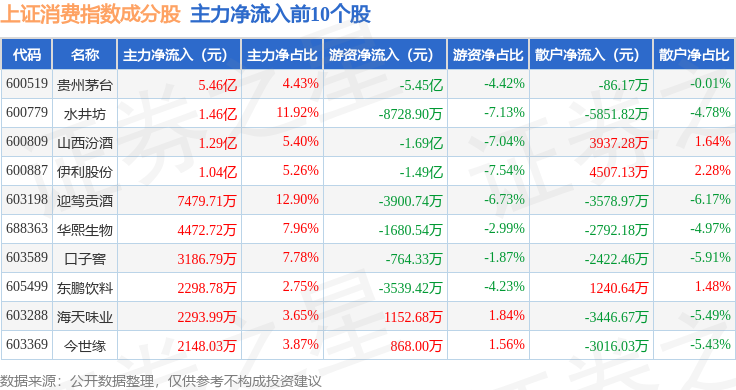 资金流向方面,上证消费(000036)指数成份股当日主力资金净流入合计8.22亿元,游资资金净流出合计8.39亿元,散户资金净流入合计1683.57万元。成份股资金流向详情见下表: