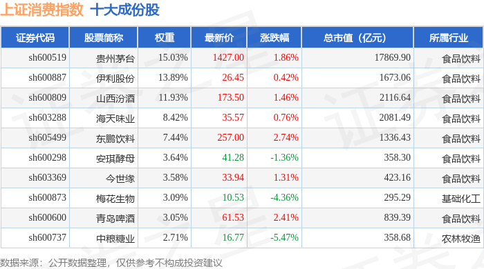上证消费(000036)指数十大成份股详情如下: