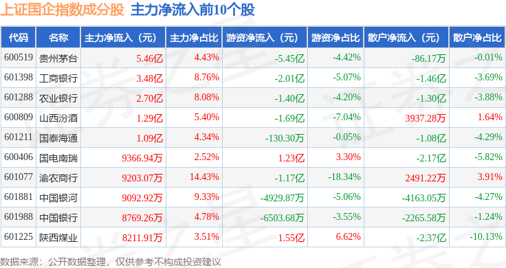 资金流向方面,上证国企(000056)指数成份股当日主力资金净流出合计74.05亿元,游资资金净流入合计8.83亿元,散户资金净流入合计65.22亿元。成份股资金流向详情见下表: