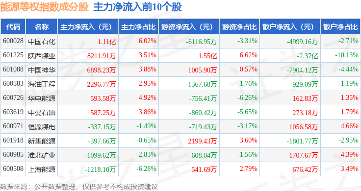 资金流向方面,能源等权(000070)指数成份股当日主力资金净流出合计10.7亿元,游资资金净流入合计4.68亿元,散户资金净流入合计6.01亿元。成份股资金流向详情见下表: