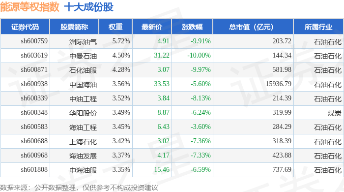 证券之星消息,2月2日,能源等权(000070)指数报收于2883.41点,跌6.11%,成交259.46亿元,换手率0.73%。当日该指数成份股中,下跌的有30家,中曼石油以10.0%的跌幅领跌。
