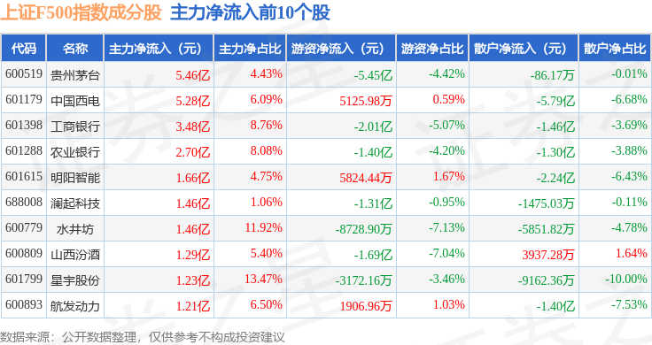 资金流向方面,上证F500(000100)指数成份股当日主力资金净流出合计258.91亿元,游资资金净流入合计86.71亿元,散户资金净流入合计172.2亿元。成份股资金流向详情见下表: