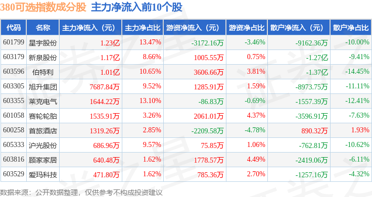 资金流向方面,380可选(000107)指数成份股当日主力资金净流出合计7959.6万元,游资资金净流入合计5.13亿元,散户资金净流出合计4.34亿元。成份股资金流向详情见下表: