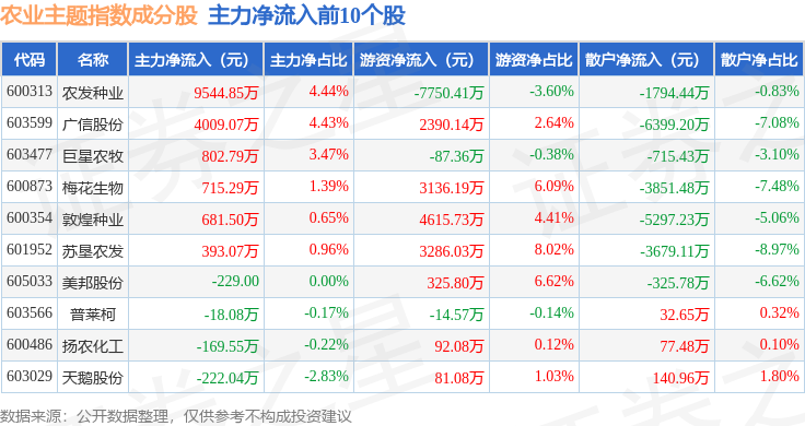 资金流向方面,农业主题(000122)指数成份股当日主力资金净流出合计5.8亿元,游资资金净流入合计3.11亿元,散户资金净流入合计2.69亿元。成份股资金流向详情见下表: